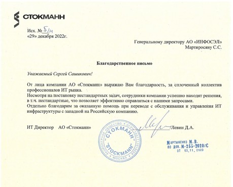 АО “СТОКМАНН” выражает благодарность за успешное решение нестандартных задач